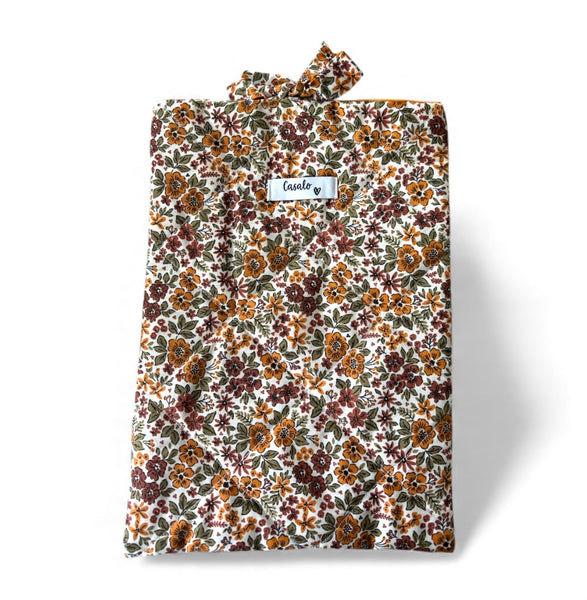 Housse de livreFormat pocket, broché ou romanTissu extérieur: coton matelassé fleurs oranges et marronsTissu intérieur: Coton orange