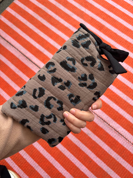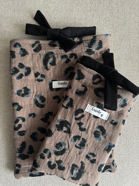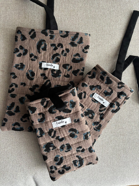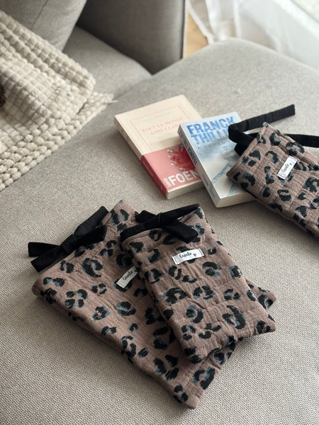 Housse de livreFormat pocket (15x22cm) et roman (22x29cm)Tissu : Coton matelassé motif léopard noir et bleu sur fond marron