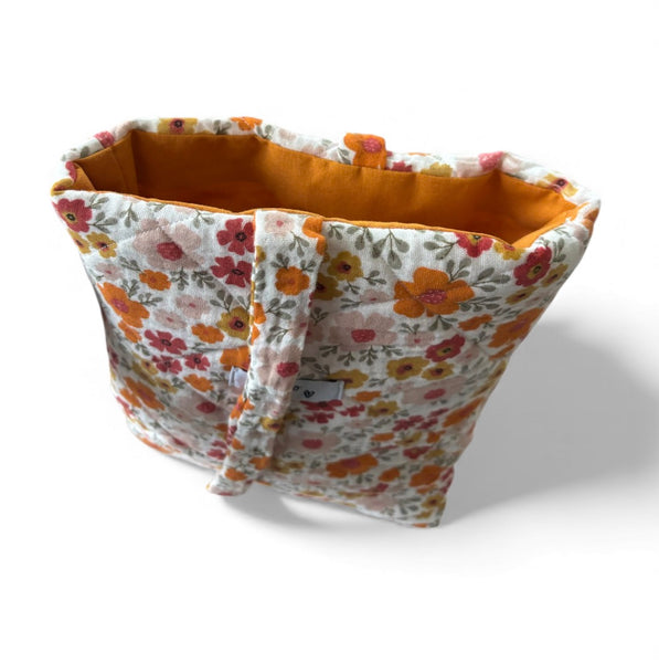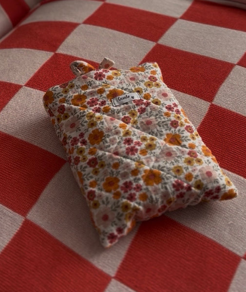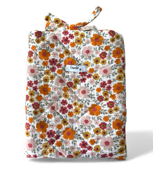Housse de livreFormat pocket, broché ou romanTissu extérieur: gaze de coton matelassé fleurs orangesTissu intérieur: Coton orange